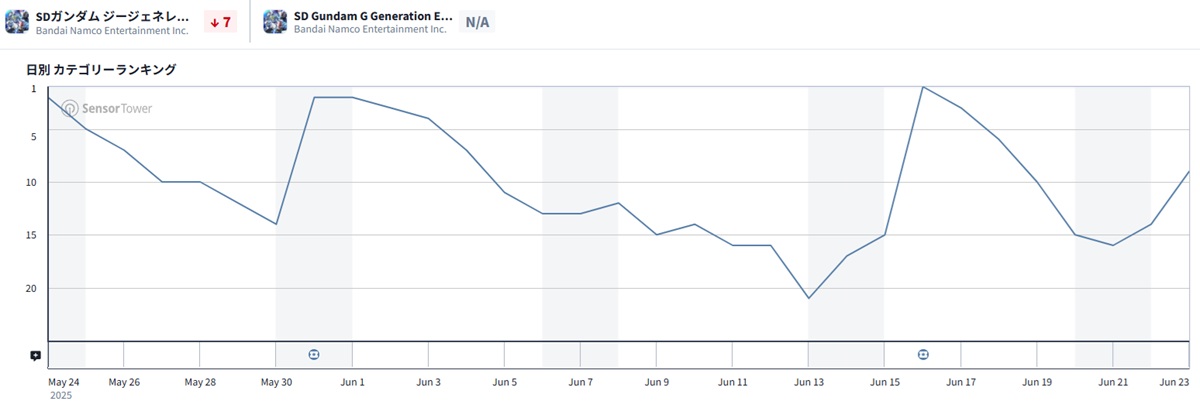 | 15 | 10 | ↓5 | SDガンダム ジージェネレーション エターナル | バンダイナムコエンターテインメント<7832>/アプリボット<4751> |