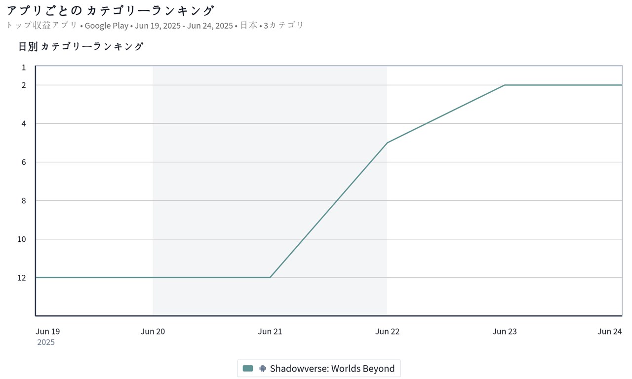 また、Cygamesの次世代スマホカードゲーム『Shadowverse: Worlds Beyond』が2位まで上昇し、いよいよ首位を目前にとらえてきた。明日6月25日11時からは、100万ダウンロード突破を記念した「勝利報酬キャンペーン」を開催することも発表しており、引き続きその動向に注目しておきたい。