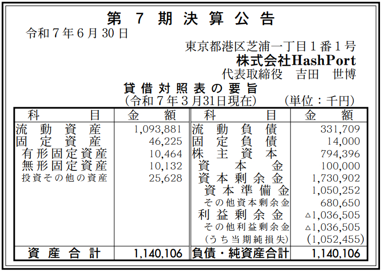 HashPort(ハッシュポート)の2025年3月期(第7期)の決算は、最終損失が10億5200万円と赤字転落となった。前の期(2024年3月期)の実績は、最終利益1500万円だった。6月30日付の『官報』に掲載された「決算公告」で判明した。