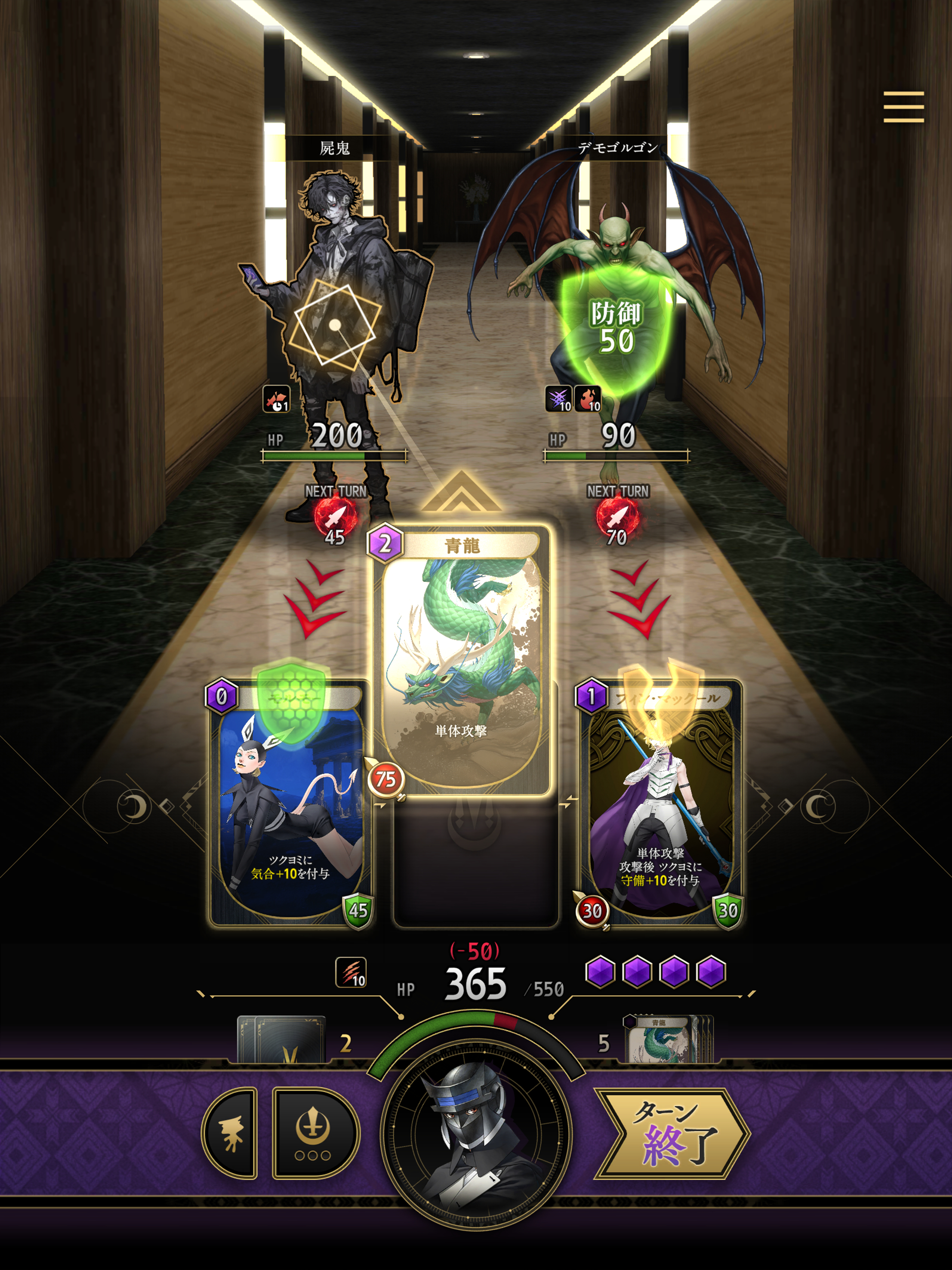 プレイヤーのターンでは、手札を「攻撃に使うか」「防御にあてるか」1アクションで選択が可能。
