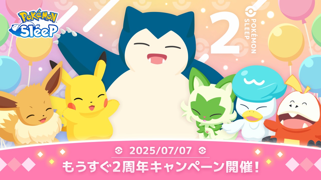 2025年7月7日から7月14日までの期間、「もうすぐ2周年キャンペーン」を開催する。期間中は、「1周年記念フェスティバル」で登場した ニャオハ ・ホゲータ・クワッスたちが再びピックアップされるほか、様々なボーナスが発生する。ぜひ毎日『Pokémon Sleep』をプレイして、2周年イベントに向けた準備をしよう。