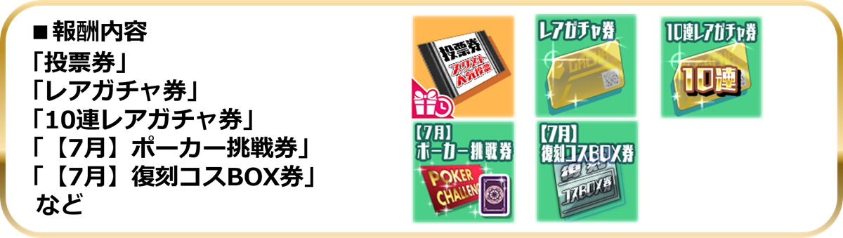 スコア到達報酬では、『投票券』や『レアガチャ券』『10連レアガチャ券』さらに、『【7月】ポーカー挑戦券』『【7月】復刻コスBOX券』などが登場!