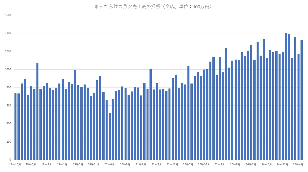 まんだらけ<2652>は、6月30日、2025年5月の月次売上高を発表し、既存店が前年同月比1.5%減の13億1900万円だった。前年同月比マイナスは2025年9月期では初となる。2024年10月からの累計売上高は4.2%増の100億2100万円だった。