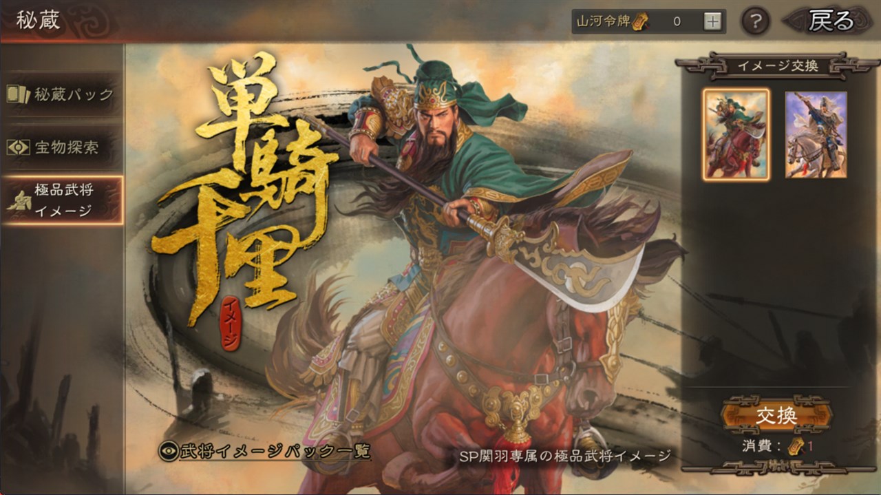 同一の秘蔵武将を複数回獲得した場合、その都度「黄鉞符節」を1つ獲得できる。それにより「宝物探索」を行うことができる。「宝物探索」でSP関羽専属の極品武将イメージ「単騎千里」とSP馬超専属の極品武将イメージ「神威天将軍」を手に入れるチャンスがある。