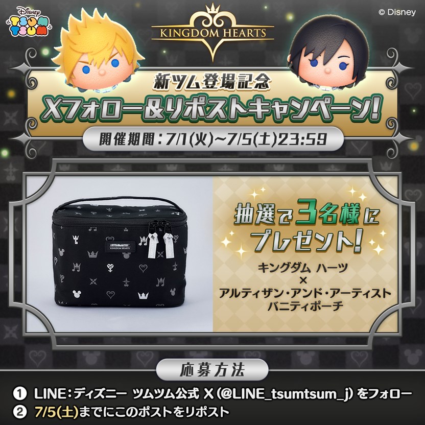『LINE:ディズニー ツムツム』公式Xアカウントにて、「キングダム ハーツ」の新ツム登場を記念した公式X(旧Twitter)フォロー&リポストキャンペーンを実施する。本キャンペーンでは抽選で3名に「キングダム ハーツ × アルティザン・アンド・アーティスト バニティポーチ」をプレゼントする。