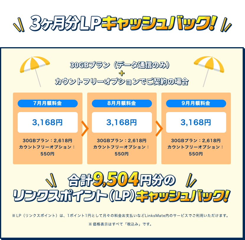 ※30GBプラン(2,618円)+カウントフリーオプション(550円)で無償LP3,000LP利用の場合:9,504円(月次決済額3ヶ月分)- 3,000LP = 6,504LPキャッシュバック