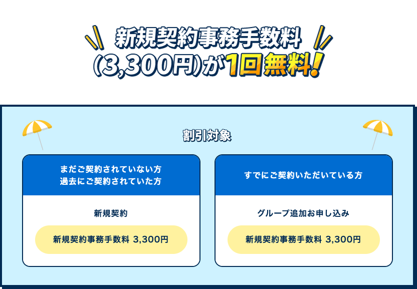 キャンペーン期間中に新規ご契約またはグループ追加を行なった場合、初回の1回のみ新規契約事務手数料(3,300円/税込み)が無料となる。
