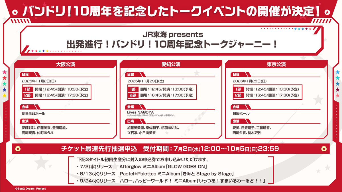 2025年11月より大阪・愛知・東京にて、バンドリ!10周年を記念したトークイベントを開催する。