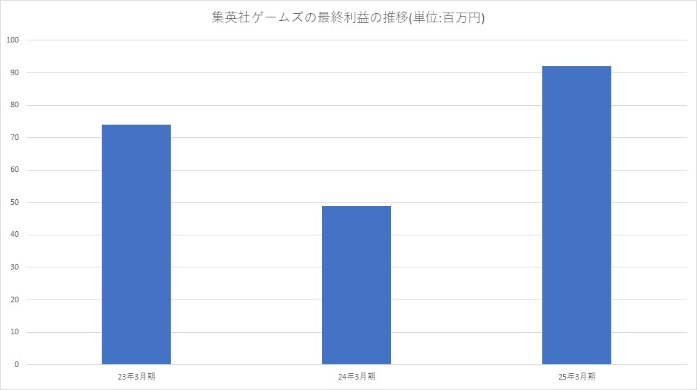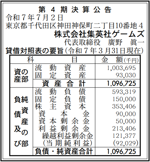 集英社ゲームズの2025年3月期(第4期)の決算は、最終利益が前の期比88.1%増の9200万円と大幅増益を達成した。これで3期連続の黒字達成となった。前の期(2024年3月期)の実績は、最終利益4800万円だった。7月2日付の『官報』に掲載された「決算公告」で判明した。