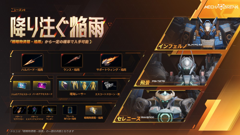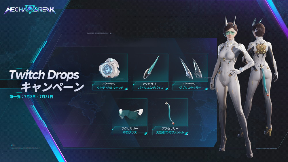 グローバルリリースを記念して、『Mecha BREAK』では「Season 0 Twitch Drops」イベントの開催が決定した。期間中、Twitch で対象チャンネルの『Mecha BREAK』配信を視聴することで、さまざまなゲーム内報酬を獲得できる。