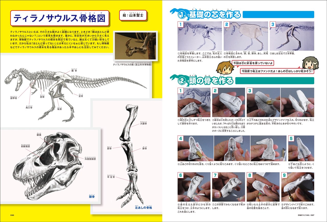 恐竜図鑑(プラテオサウルス、ステゴサウルス、アロサウルス、ケラトサウルス、ディプロドクス、ブラキオサウルス、リオプレウロドン、カルカロドントサウルス、カルノタウルス、アマルガサウルス、スピノサウルス、パラサウロロフス、トリケラトプス、エウオプロケファルス、ケツアルコアトルス、パキケファロサウルス、プロトケラトプス、ヴェロキラプトル、ティラノサウルス)/恐竜のつくりかた/初級編 トリケラトプスの親子を作る/初級編 カマラサウルスを作る/中級編 ティラノサウルスを作る うろこバージョン/上級編 ティラノサウルスを作る 羽毛バージョン/恐竜の系統図/羽毛恐竜と鳥類についての最新の学説/コラム(恐竜の定義、羽毛ティラノサウルスについて)