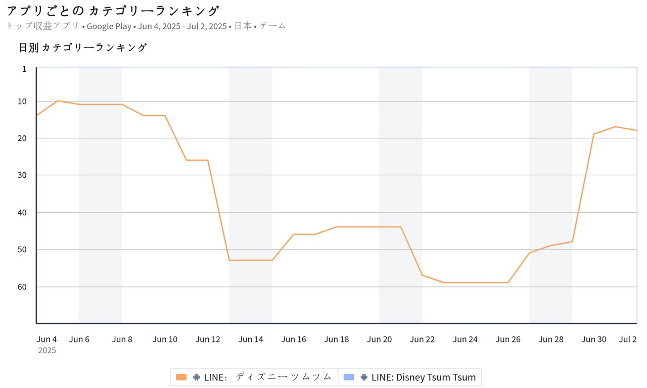 トップ10圏内では、LINEヤフー<4689>とNHN PlayArtの『LINE:ディズニー ツムツム』が前日の17位から9位に浮上してきた。『ツムツム』は、7月1日0時より、「キングダム ハーツ」シリーズのボイス付き新ツム「ロクサス」と「シオン」の2種類が登場していることが売上に大きく寄与しているようだ。