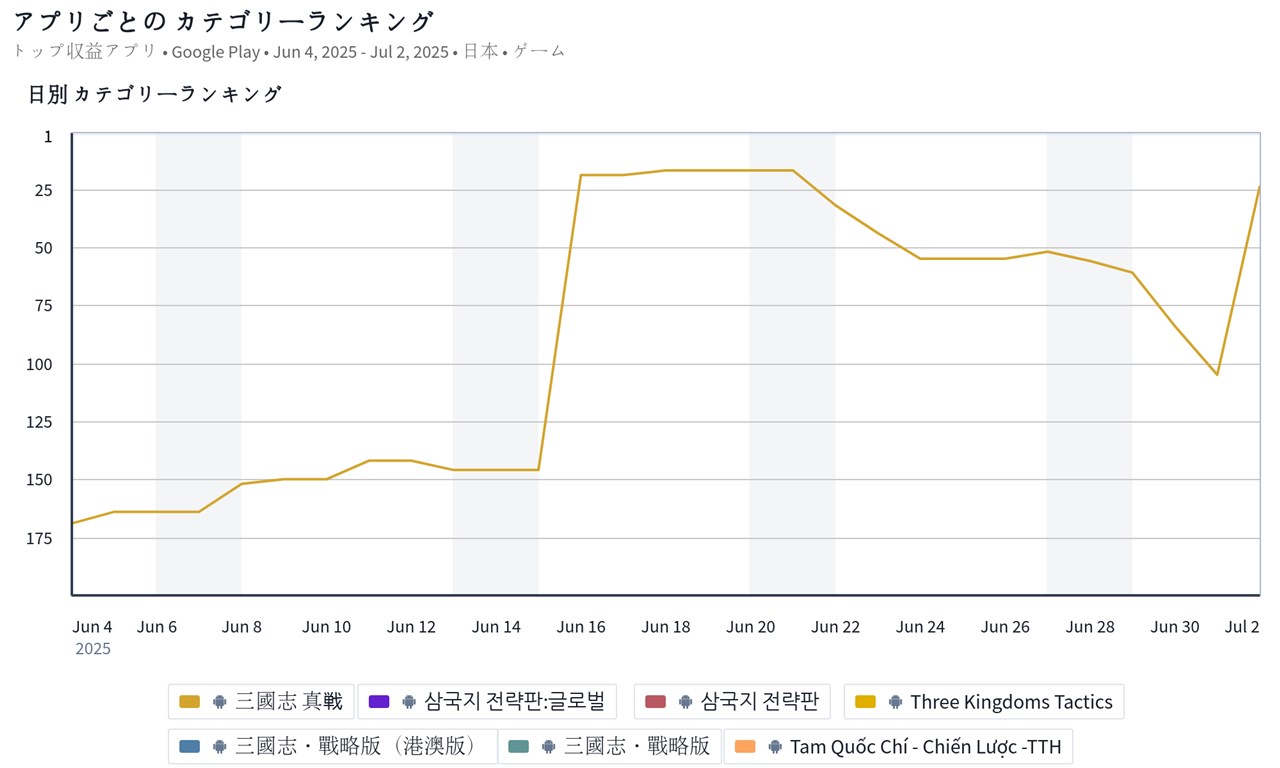また、Qookkaの『三國志 真戦』が前日の105位から25位に飛び込んできた。『三國志 真戦』は、7月1日より、夏のお祭りイベントを開始しており、S1、S2、S3シーズン名将パックが復刻となったほか、『真・三國無双8 Empires』コラボ武将の「無双曹丕」と「無双呂玲綺」もコラボパックに復刻登場していることなどが今回の順位上昇につながっているもよう。