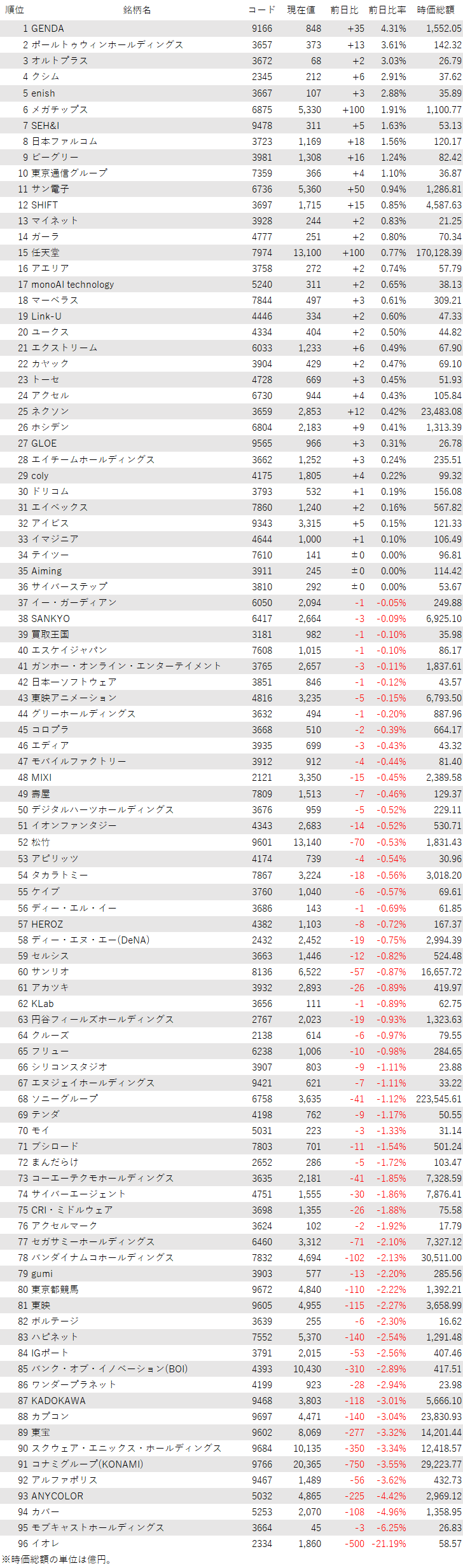 こうしたなか、ゲーム・エンタメ関連企業をみると、登録されている96銘柄のうち、上昇は33銘柄(34%)、下落は60銘柄(63%)、変わらずは3銘柄(3%)で、下落した銘柄の方が多かった。