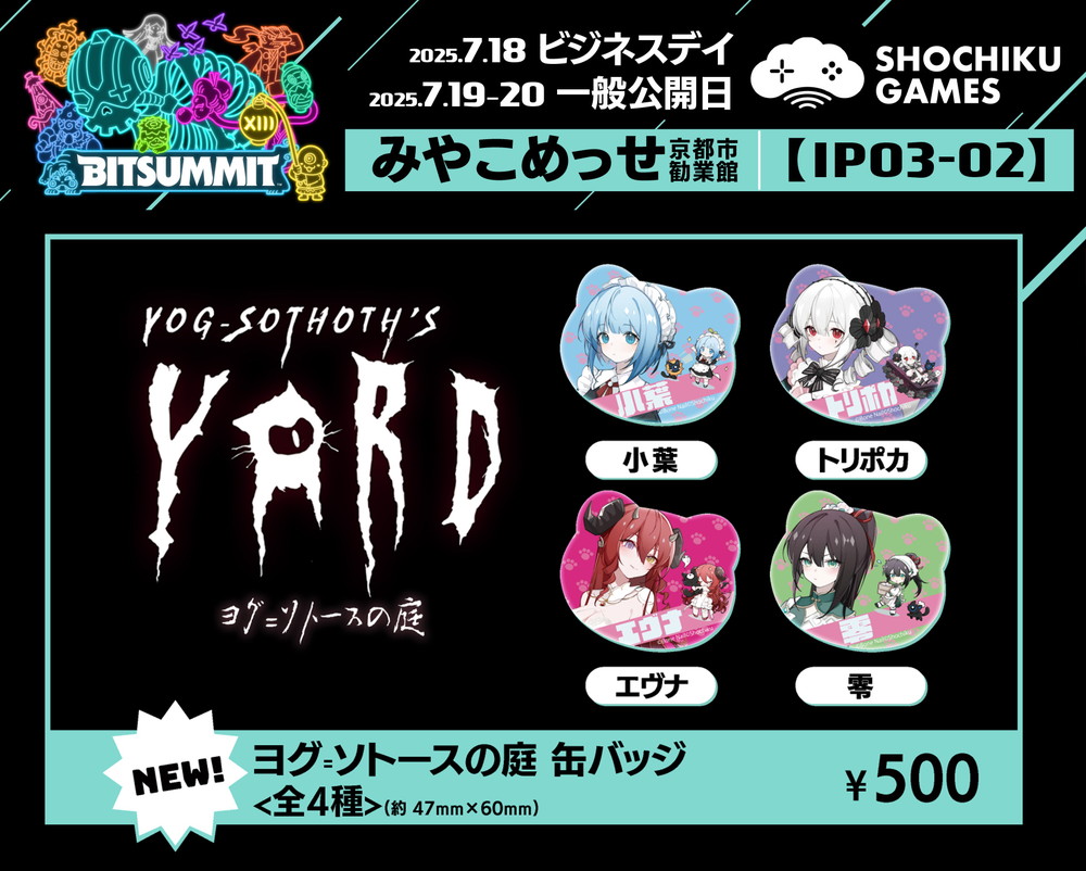 このたび、2025年7月18日~20日京都市勧業館みやこめっせで開催される「BitSummit the 13th」に本作も出展することを発表した。松竹ブースでは日本語実装したデモ版を特別に先行試遊体験ができる。そして、日本初の公式グッズ販売やオリジナルノベルティカードも配布予定で、存分に『ヨグ=ソトースの庭』の魅力を発信するのでぜひ立ち寄って欲しい。