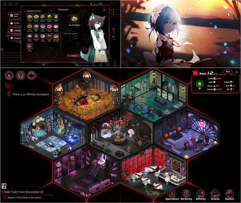 また、ホテル管理に加え、資源収集や料理、錬金術などの要素、神託システムを活用したSAN値(正気値)の管理も攻略する上で重要なポイントとなっている。