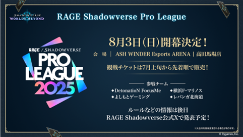 DetonatioN FocusMe、横浜F・マリノス、よしもとゲーミング、レバンガ北海道の全4チームによるリーグ戦。各節でのトーナメント順位に応じた獲得ポイントに加え、関連大会成績やインフルエンサーバトルで獲得したポイント合計の上位2チームが、年間チャンピオンを決める「RAGE Shadowverse Pro League Championshipに進出。