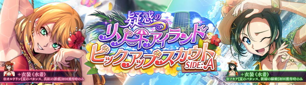 「疑惑のリゾートアイランド ピックアップスカウトSIDE:A」では新パイロット、★4オルドリン[夏のバカンス、真紅の誘惑]と★4ソキア[夏のバカンス、新緑の躍動]が、「疑惑のリゾートアイランド ピックアップスカウトSIDE:B」では新パイロット、★4レイラ[夏のバカンス、黄金色の奇跡]が登場!