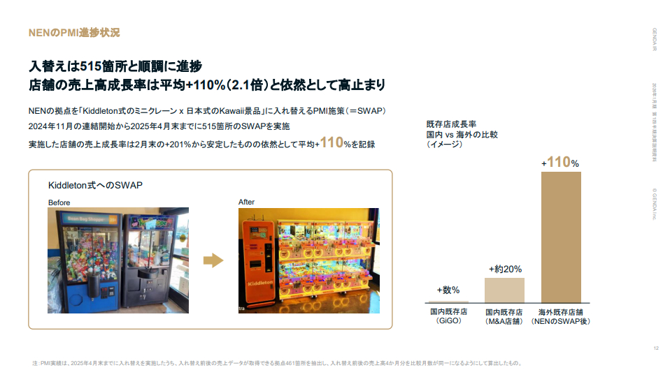 成長の鍵を握る海外事業が高い成長を見せているそうだ。米国でも中核のNENとPlayerOneを活かしクレーンゲーム機の入れ替えと日本型の景品投入で既存店売上が110%増と大きく伸びている。