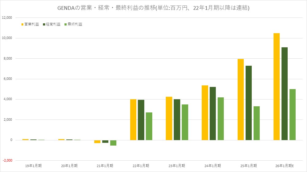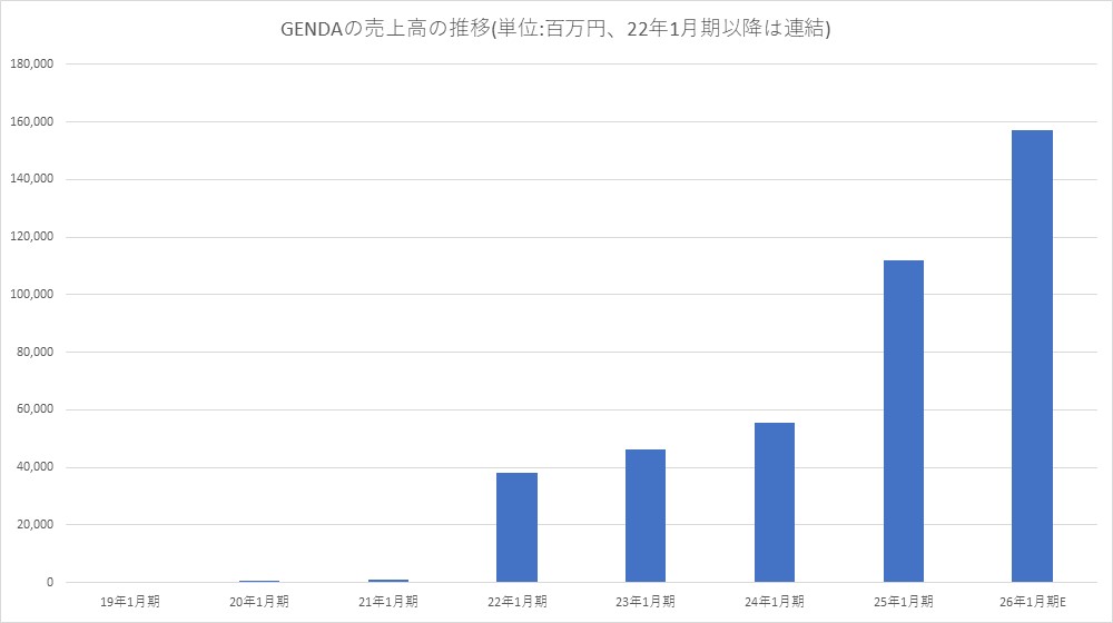 GENDA<9166>は、2026年1月期の連結決算について、売上高1570億円(前期比40.4%増)、営業利益105億円(同32.6%増)、経常利益91億円(同25.4%増)、最終利益50億円(同53.7%増)を計画している。期初に発表した見通しからは変更はない。