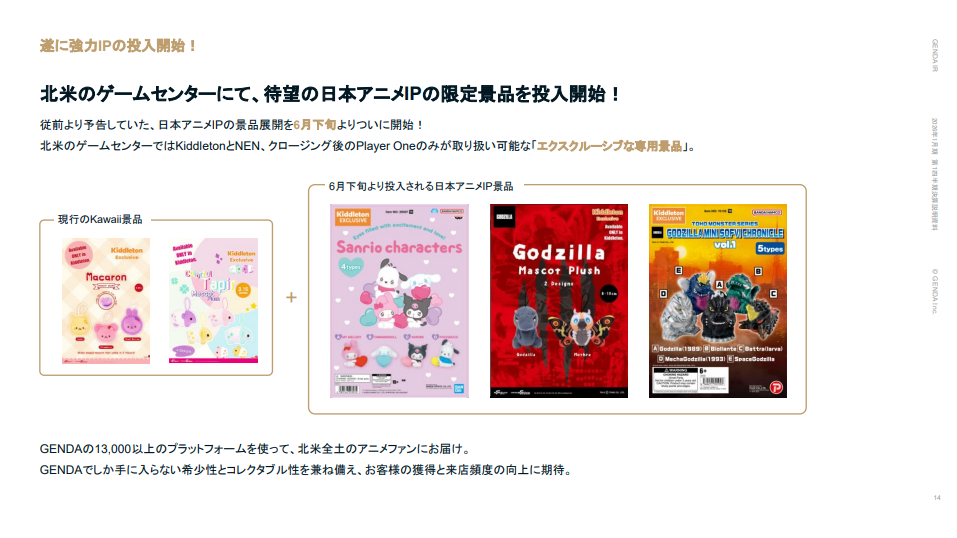 6月下旬からはサンリオのキャラクターやゴジラなど有力IPの景品を投入し、顧客の獲得と来店頻度の向上でさらなる拡大を狙う。