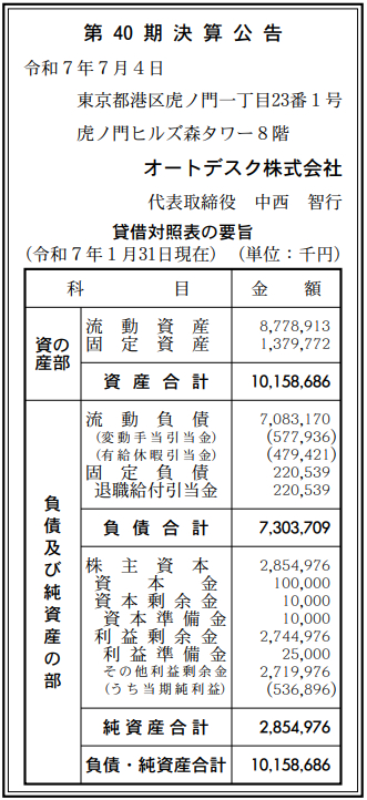 オートデスクの2025年1月期(第40期)の決算は、最終利益が前の期比35.9%増の5億3600万円と大幅増益を達成した。前の期(2024年1月期)の実績は、最終利益3億9400万円だった。7月4日付の『官報』に掲載された「決算公告」で判明した。