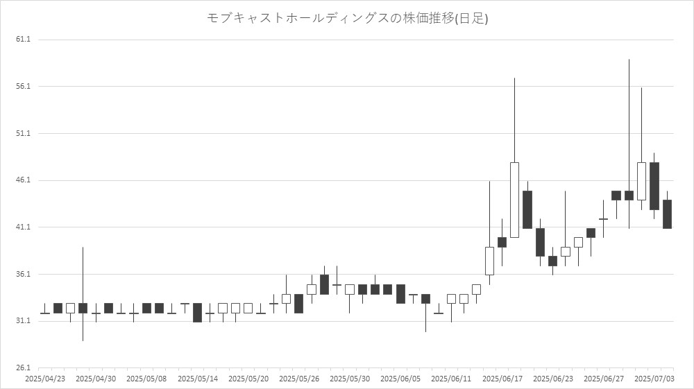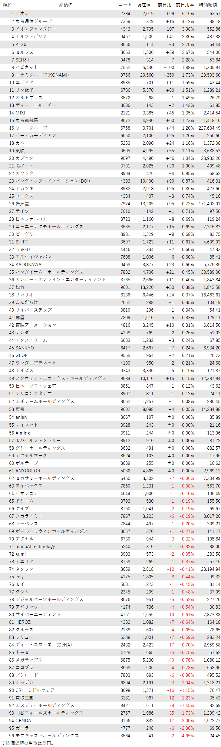 その他の個別銘柄では、イオレ<2334>や東京通信グループ<7359>、イオンファンタジー<4343>、アルファポリス<9467>が買われた一方、モブキャストホールディングス<3664>、ガーラ<4777>、GENDA<9166>、円谷フィールズホールディングス<2767>が売られた。