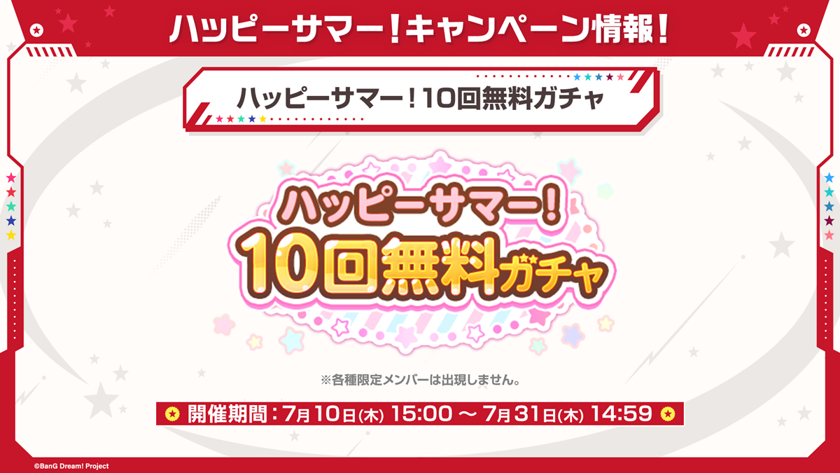 7月10日(木)15時~7月31日(木)14時59分までの期間中、1回のみ10回無料ガチャが引けるキャンペーンを開催する。