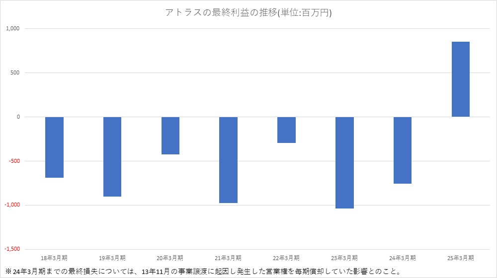 セガサミーホールディングス<6460>のグループ会社であるアトラスの2025年3月期(第12期)の決算は、最終利益が8億5400万円と黒字転換を達成した。前の期(2024年1月期)の実績は、最終損失7億5700万円だった。最終赤字が続いていたが、リリースしたタイトルの販売不振など業績悪化によるものではなく、2013年の事業譲渡に起因し発生した営業権(のれん)を毎期償却していた影響とのこと(資産の項目にあった「のれん」がなくなっており、償却は完了した模様)。