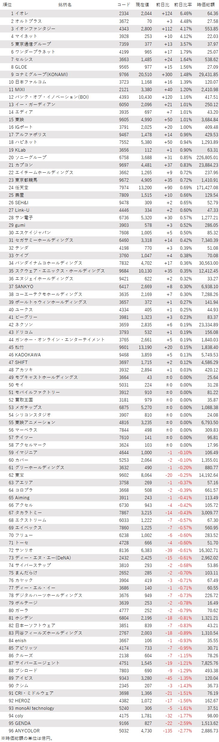 そうした中でゲーム・エンタメ関連株の動きを見てみると、下記の表に登録しているゲーム・エンタメ関連企業96銘柄のうち、上昇は48銘柄(50%)、下落は38銘柄(40%)、変わらずは10銘柄(10%)で、上昇した銘柄のほうが多かった。