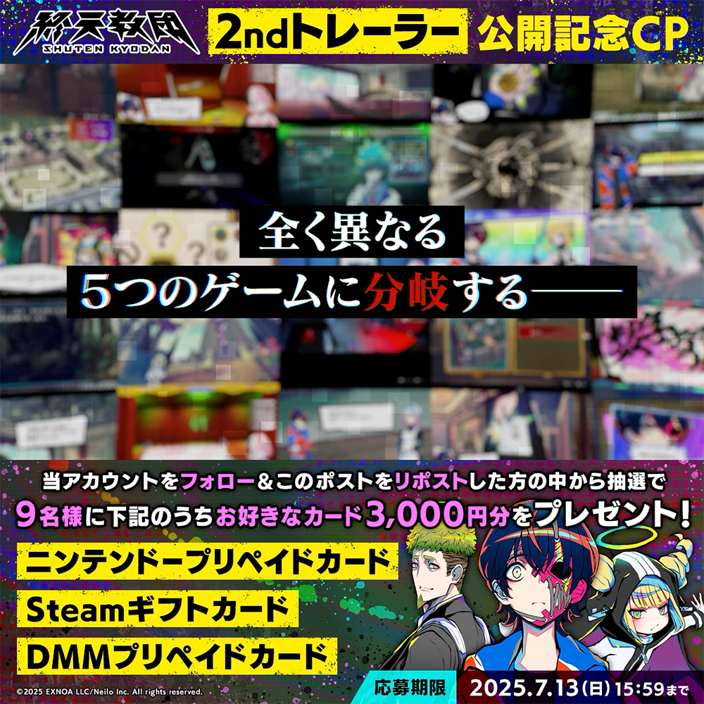 2ndトレーラー公開を記念し、『終天教団』公式Xにて「ニンテンドープリペイドカード」「Steamギフトカード」「DMMプリペイドカード」の中から好きなプリペイドカード3,000円分を抽選で9名にプレゼントするリポストキャンペーンを開催中。