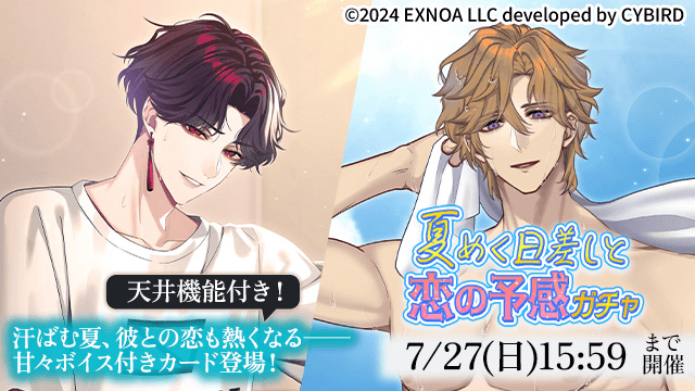 DMM GAMESを運営するEXNOAは、Romanteen18シリーズの第1弾・オトナの女性向け恋愛ゲーム「夢幻楼と眠れぬ蝶」にて、新たなゲーム内イベント「オトナのSEXY♡SUMMER ~朝も昼も、夜も繋がって~」と 「夏めく日差しと恋の予感ガチャ」の開催と、「七夕限定エールセット」を販売することを発表した。
