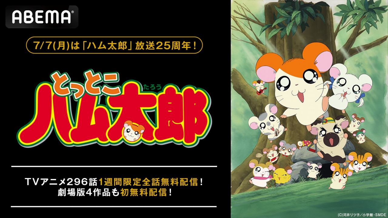 ABEMAは、2025年7月7日にアニメ『とっとこハム太郎』が放送25周年を迎えたことを記念し、TVシリーズ296話及び劇場版4作品の無料配信を開始する。