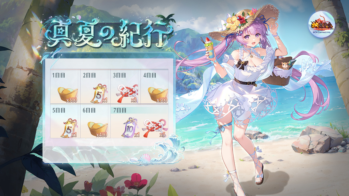 7日間のログインイベント。開催期間中、ゲームにログインすると元宝や高速戦闘券、絆の水引などの報酬を獲得できる。