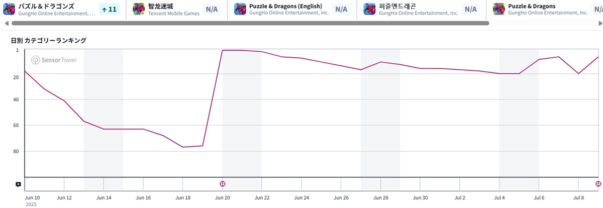 ガンホー・オンライン・エンターテイメント<3765>の『パズル&ドラゴンズ(パズドラ)』が21位から7位まで順位を上げている。