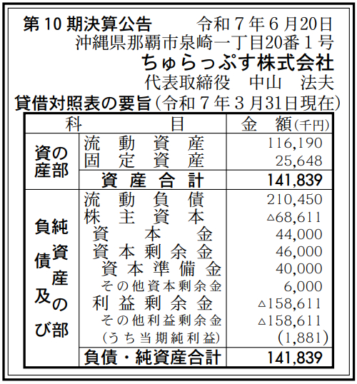 ちゅらっぷすの2025年3月期(第10期)の決算は、最終利益が100万円と黒字転換を達成した。債務超過前の期(2024年3月期)の実績は、最終損失6200万円だった。7月10日付の『官報』に掲載された「決算公告」で判明した。