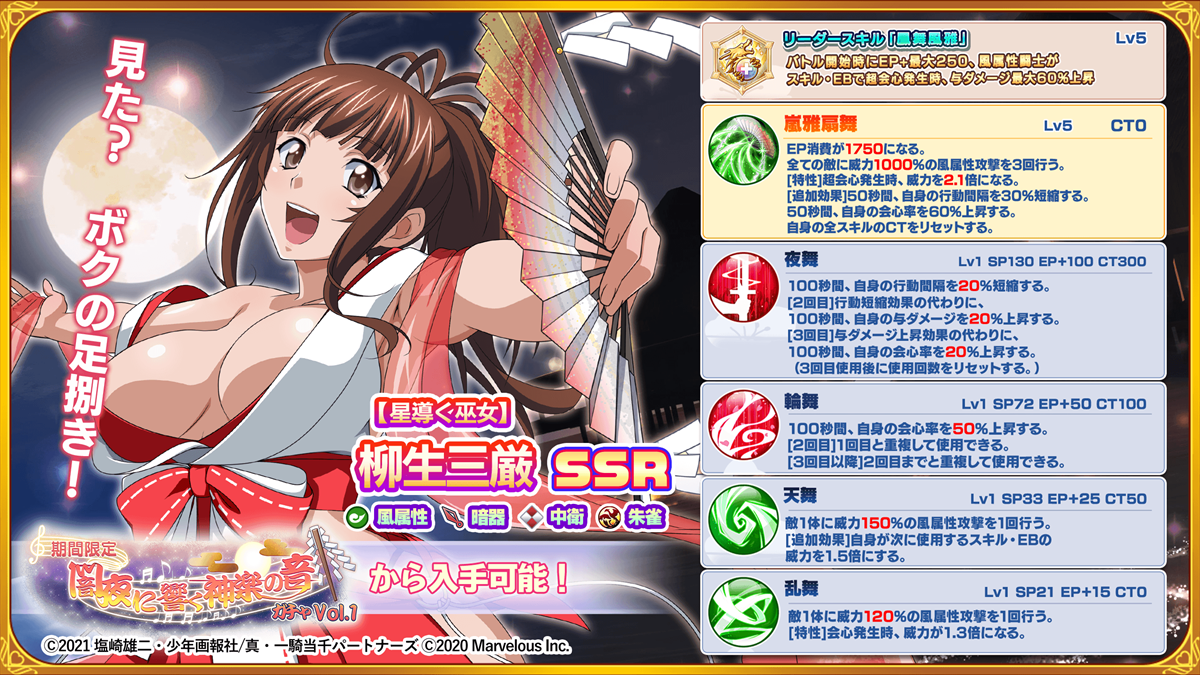 本日開始の「闇夜に響く神楽の音ガチャVol.1」では、新たに「【星導く巫女】柳生三厳」(CV:田辺 留依)が登場!