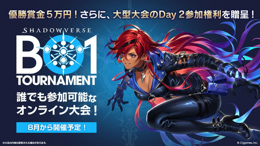 2025年8月から「Shadowverse BO1 TOURNAMENT」が開催される。本大会は数時間で完結する BO1形式で実施する大会となっており、優勝者に5万円、準優勝者に1万円が贈呈される。さらに今回から、優勝者に大型大会の Day2参加権利も合わせて贈呈される。
