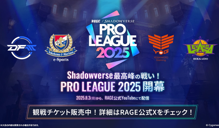 「RAGE Shadowverse Pro League2025」が 2025 年 8 月 3 日から開幕する。現在開幕戦の会場観戦チケットを販売中。今回のプロリーグでは、「インフルエンサーバトル」という新しいルールが追加される。「インフルエンサーバトル」は、毎節ゲストとして参加するインフルエンサーが各チームの代表としてバトルし、その勝敗が各チームに勝利ポイントとして加算される。詳しくは RAGE Shadowverse Pro League公式サイトを確認してほしい。