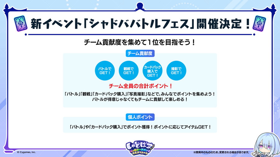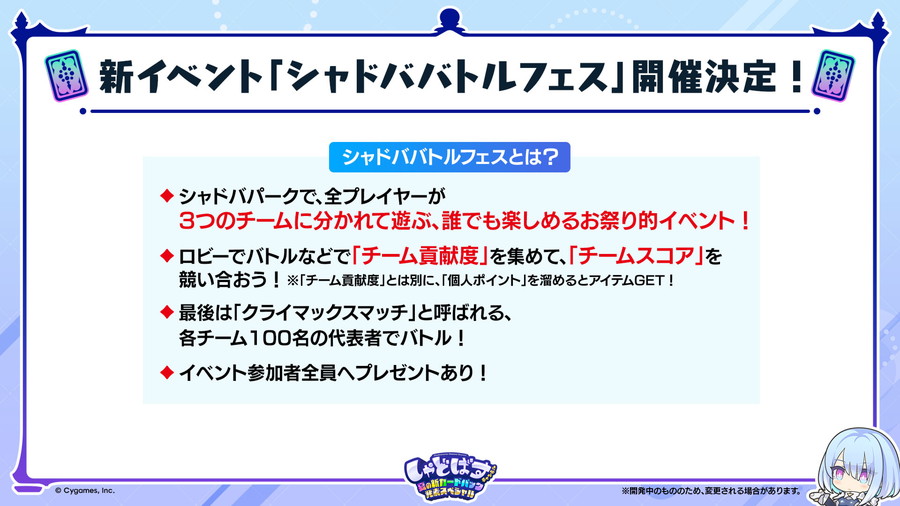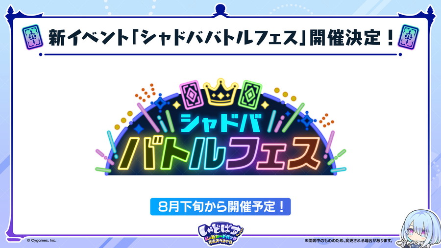 「シャドバパーク」内の全プレイヤー参加型のゲーム内新イベント「シャドババトルフェス」の開催が決定した。「シャドババトルフェス」は2025年8月下旬から開催予定。