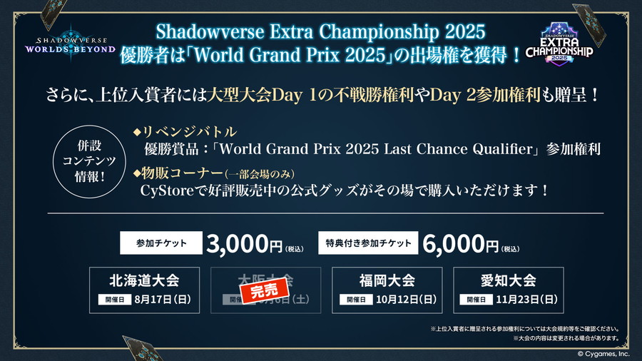 「Shadowverse World Grand Prix 2025」の出場権が与えられる「Shadowverse Extra Championship 2025」の参加チケットが発売中。現在大阪大会は完売となっており、北海道、福岡、愛知大会は現在参加チケットを販売中。詳しくは特設サイトを確認してほしい。