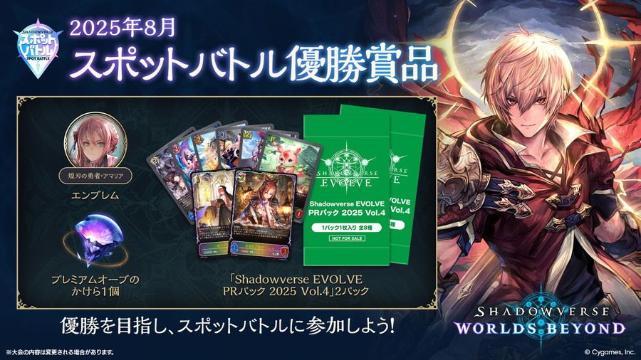 2025年8月からスポットバトルのサポートが正式に開始される。参加賞は主催店舗が選んだエンブレム1種が手に入り、そして『Shadowverse EVOLVE』の PR パックもプレゼントされる。また、優勝者には《煌刃の勇者・アマリア》のエンブレムとプレミアムオーブのかけらが 1 個、そして『Shadowverse EVOLVE』の PR パックが追加で2パック贈呈される。
