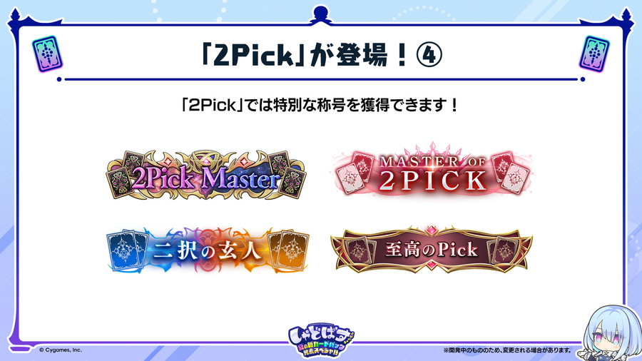 前作『Shadowverse』でもおなじみの「2Pick」が、『シャドウバース ワールズビヨンド』に 2025 年 8 月中に追加予定。「2Pick」とは提示した 2 枚組のカードを選択していき、30 枚のカードで構築したデッキでバトルをするモード。前作『Shadowverse』では、ランダムに提示した 3 クラスの中から、遊ぶクラスを選ぶ形式だったが、『シャドウバース ワールズビヨンド』では7クラスすべての中から選ぶことができる。