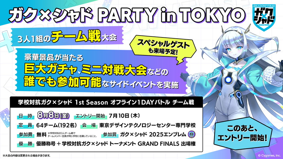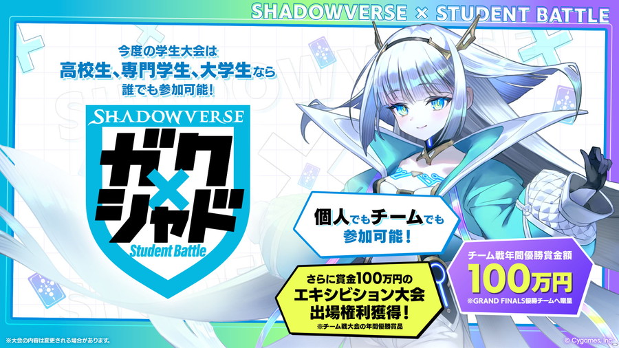 「ガク×シャド」とは、大会はもちろんシャドバ初心者でも楽しめる、すべての学生に『シャドウバース ワールズビヨンド』を通じて最高の学生生活を送るための学生向けプロジェクト。「ガク×シャド」で実施される学生大会は、1日で完結するオフライン個人戦と、年間を通して実施する優勝賞金100万円の学校対抗の3人チーム戦の2種類がある。