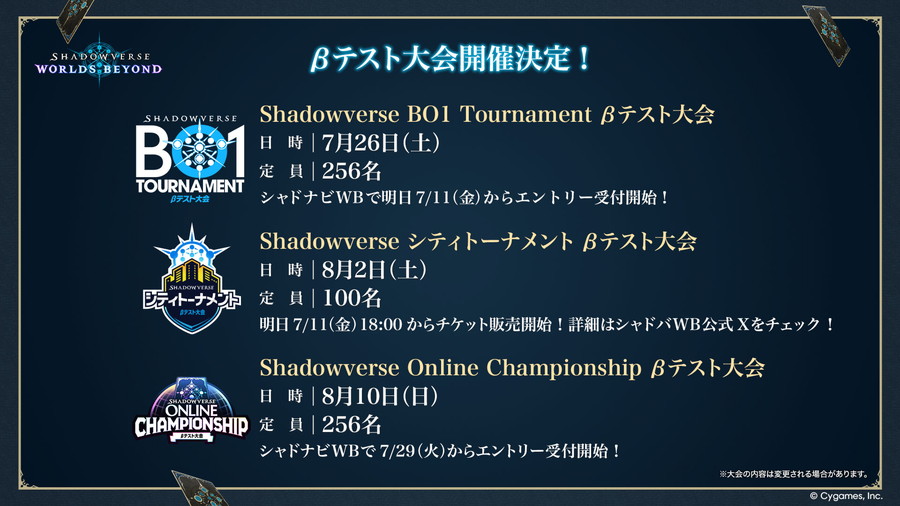 「Shadowverse BO1 TOURNAMENT」、「Shadowverse シティトーナメント」、「Shadowverse Online Championship 2025」のβテスト大会の開催が決定した。詳細は各大会の HP やお知らせを確認してほしい。