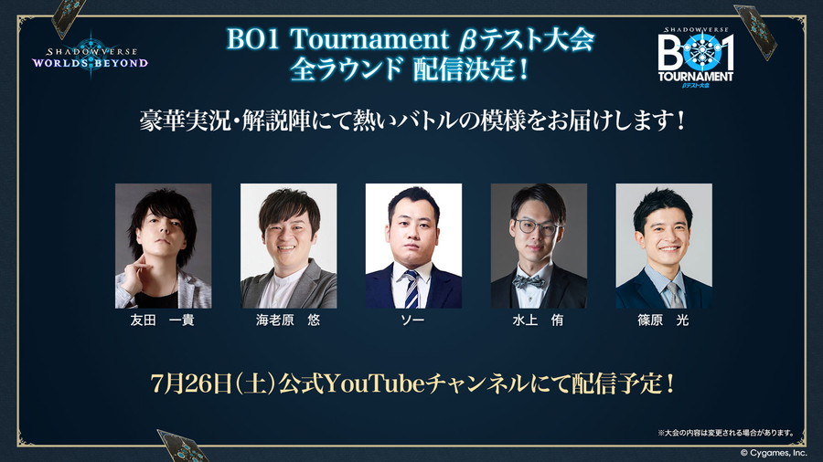 βテスト大会は、今後開催される『シャドウバース ワールズビヨンド』の各公式大会を円滑に進行していくために、ユーザーの力を借りて運営上の様々なテストを兼ねて実施する大会。テスト大会のため、大会運営でトラブルが発生する場合もある。そのため賞金や大型大会の Day2参加権利などは用意していない。各大会ごとにちょっとした参加賞や優勝賞品、参加者に抽選であたる賞品などを用意する予定。