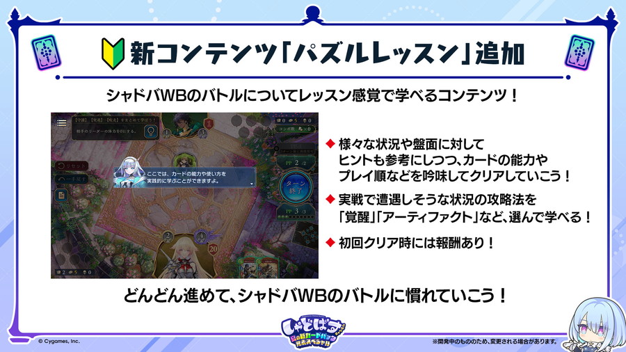 『シャドウバースワールズビヨンド』のバトルについて、パズルやクイズ感覚で学ぶことができるコンテンツ。ヒントも参照できるので、はじめて『シャドウバース ワールズビヨンド』に触れる人でも気軽に挑戦できる。