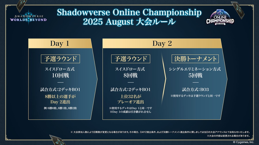 「Shadowverse Online Championship 2025 August」が 8 月 23 日,24 日に開催される。本大会のエントリーは「シャドナビ WB」で7月29日から開始する。
