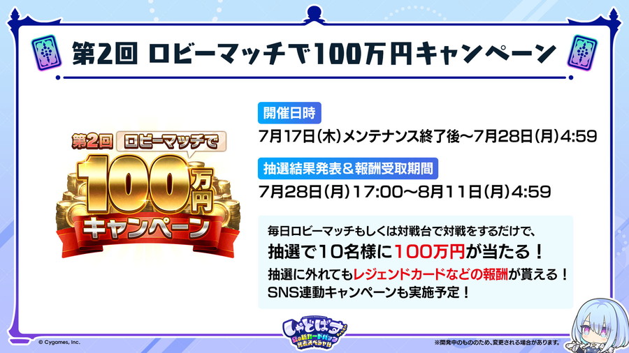 リリース1か月を記念して、毎日「シャドバパーク」内で挑戦できるキャンペーンミッションを達成することで、「100 万円キャンペーン宝箱」を 1 個獲得できる「第 2 回 ロビーマッチで 100 万円キャンペーン」を開催する。