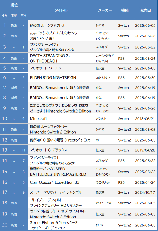 このほか、PS5からは『DEATH STRANDING 2』が4 位にランクインし、存在感を示したという。また定番タイトルの『Minecraft』などもトップ10圏内を維持しており、根強い人気がうかがえる。